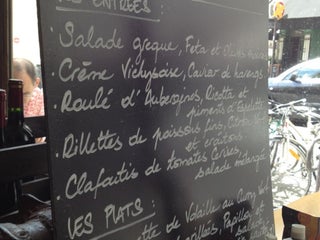 Plats français traditionnels servis dans un décor rustique avec chaises dépareillées et carrelage d'époque.